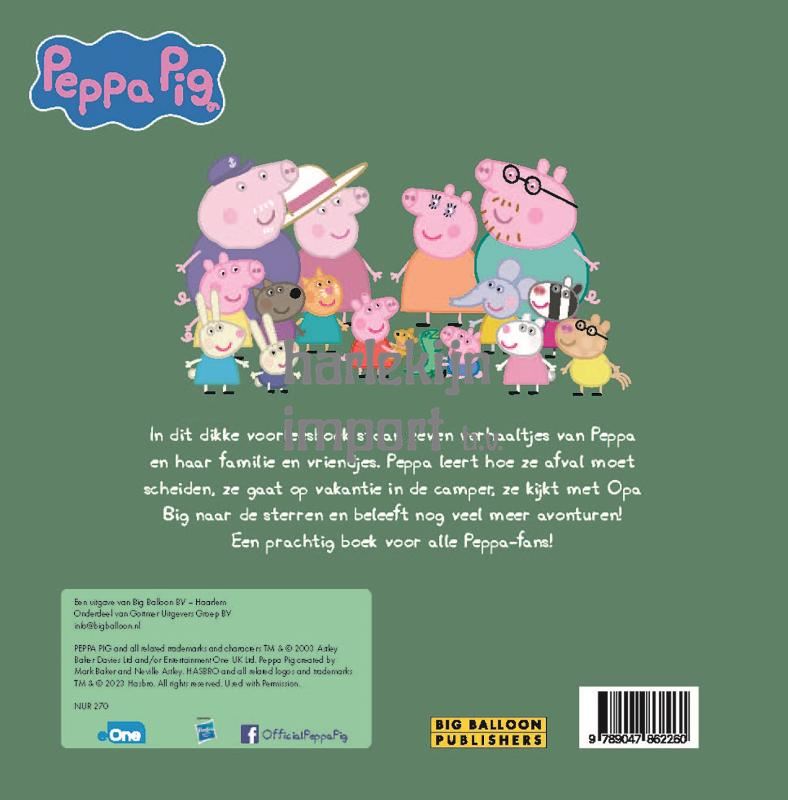 'Peppa's voorleesboek' is een superdik voorleesboek en een ideale manier om kennis te maken met Peppa en haar vriendjes. De avontuurlijke verhaaltjes en kleurrijke illustraties in 'Peppa's voorleesboek' zijn heel herkenbaar voor peuters en kleuters. De zeven afzonderlijke Peppa Pig-verhaaltjes zijn heel geschikt om voor te lezen bij het naar bed brengen en je kind op een prettige manier in slaap te krijgen. Peppa Pig is het schattige en ondeugende biggetje uit de gelijknamige wereldberoemde en razend populaire animatieserie. Ze woont samen met haar kleine broertje George, Mama Big en Papa Big en houdt van spelletjes spelen, verkleden, dagjes uit en in modderpoelen springen! Peppa's avonturen eindigen altijd goed en met een vrolijke knor.