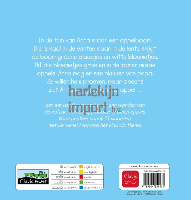 In de tuin van Anna staat een appelboom. Die is kaal in de winter, maar in de lente krijgt de boom groene blaadjes en witte bloemetjes. Uit die bloemetjes groeien in de zomer mooie appels. Anna mag er een plukken van papa. Ze willen hem proeven, maar opeens ziet Anna een gaatje in de appel … Een eenvoudig verhaal over een wonder van de natuur: aan de appelboom groeien appels. Voor peuters vanaf 24 maanden, met de wereld rondom het kind als thema.