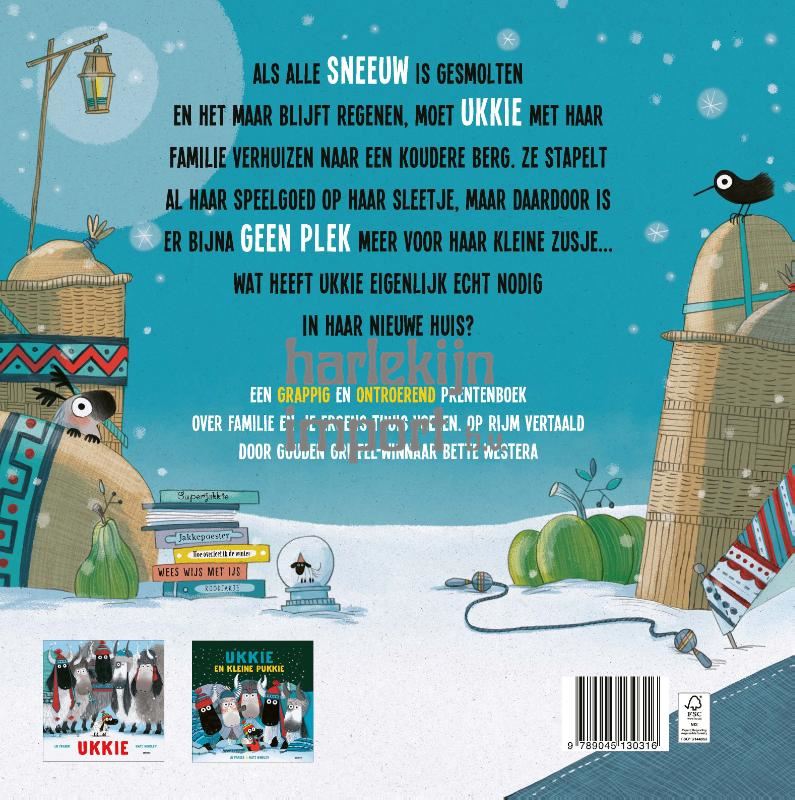 Als de sneeuw smelt en het steeds meer begint te regenen, moeten Ukkie en haar familie verhuizen naar een koudere berg. Ukkie wil al haar spullen meenemen op haar slee. Maar die is daardoor zo vol dat haar kleine zusje Pukkie er onderweg vanaf valt. Zal Ukkie inzien dat thuis zoveel meer is dan de spullen die erin staan? een hartverwarmend prentenboek over wat thuis echt thuis maakt. Op rijm vertaald door Gouden Griffel-winnaar Bette Westera.
