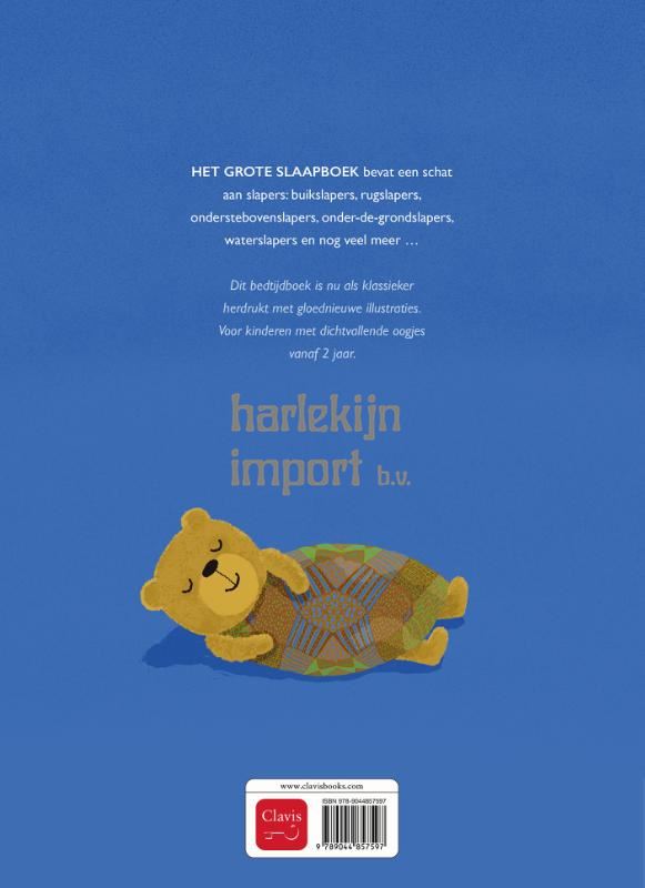 HET GROTE SLAAPBOEK bevat een schat aan slapers: buikslapers,rugslapers, onderstebovenslapers, onder-de-grondslapers, waterslapers en nog veel meer … Dit bedtijdboek is nu als klassieker herdrukt met gloednieuwe illustraties. Voor kinderen met dichtvallende oogjes vanaf 2 jaar.