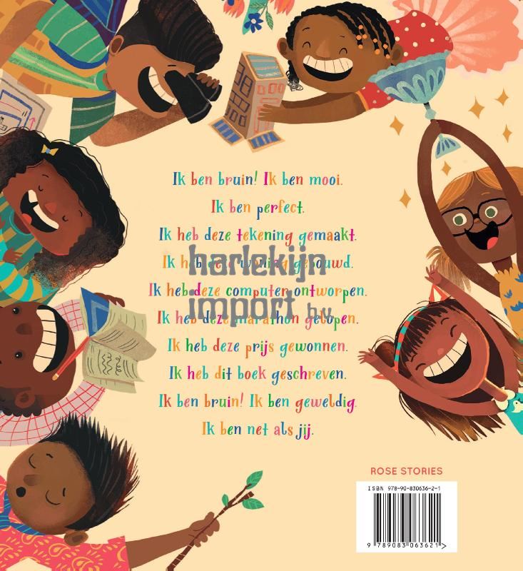 Ik ben bruin! Ik ben mooi. Ik ben perfect. Ik heb deze tekening gemaakt. Ik heb deze woning gebouwd. Ik heb deze computer ontworpen. Ik heb deze marathon gelopen. Ik heb deze prijs gewonnen. Ik heb dit boek geschreven. Ik ben bruin! Ik ben fantastisch. Ik ben net als jij.