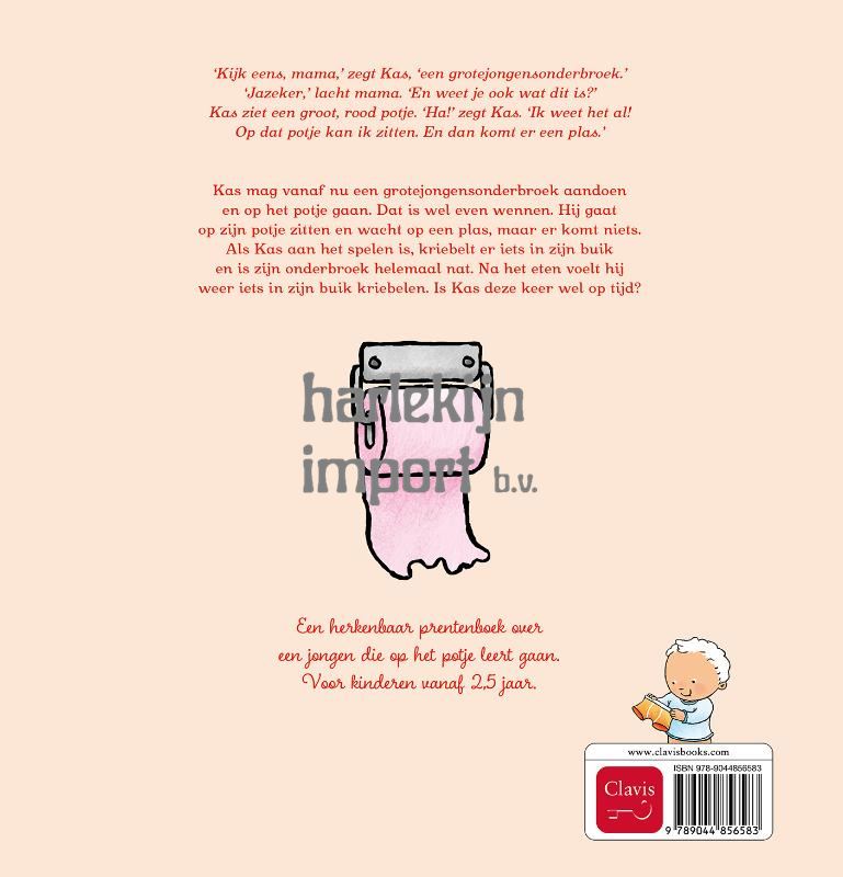 ‘Kijk eens, mama,’ zegt Kas, ‘een grotejongensonderbroek.’ ‘Jazeker,’ lacht mama. ‘En weet je ook wat dit is?’ Kas ziet een groot, rood potje. ‘Ha!’ zegt Kas. ‘Ik weet het al! Op dat potje kan ik zitten. En dan komt er een plas.’ Kas mag vanaf nu een grotejongensonderbroek aandoen en op het potje gaan. Dat is wel even wennen. Hij gaat op zijn potje zitten en wacht op een plas, maar er komt niets. Als Kas aan het spelen is, kriebelt er iets in zijn buik en is zijn onderbroek helemaal nat. Na het eten voelt hij weer iets in zijn buik kriebelen. Is Kas deze keer wel op tijd? Een herkenbaar prentenboek over een jongen die op het potje leert gaan. Voor kinderen vanaf 2,5 jaar.