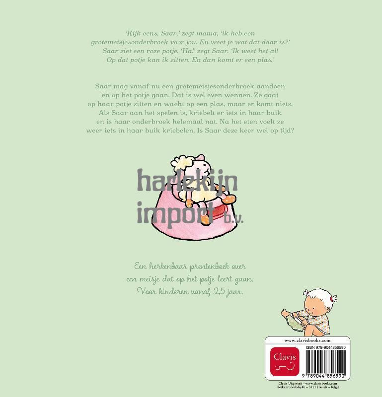 ‘Kijk eens, Saar,’ zegt mama, ‘ik heb een grotemeisjesonderbroek voor jou. En weet je wat dat daar is?’ Saar ziet een roze potje. ‘Ha!’ zegt Saar. ‘Ik weet het al! Op dat potje kan ik zitten. En dan komt er een plas.’ Saar mag vanaf nu een grotemeisjesonderbroek aandoen en op het potje gaan. Dat is wel even wennen. Ze gaat op haar potje zitten en wacht op een plas, maar er komt niets. Als Saar aan het spelen is, kriebelt er iets in haar buik en is haar onderbroek helemaal nat. Na het eten voelt ze weer iets in haar buik kriebelen. Is Saar deze keer wel op tijd? Een herkenbaar prentenboek over een meisje dat op het potje leert gaan. Voor kinderen vanaf 2,5 jaar.