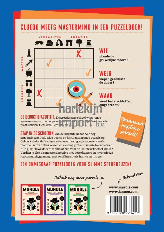 De razend populaire Murdle-puzzelserie is terug om je scherpzinnigheid te testen met 50 logicapuzzels die zich afspelen op het duistere en mysterieuze Deduction College. Kun jij deze zaken oplossen vóór de laatste bel gaat? Verdien je plek als meester-detective met deze spannende verzameling puzzels. Gebruik deductief redeneren en een handig logica-rooster om de sluwe dader te ontmaskeren en een nog groter mysterie te ontrafelen. Gevuld met illustraties, codes en interactieve elementen, en doordrenkt met humor en intrige: Deductive Logico is terug van nooit weggeweest.