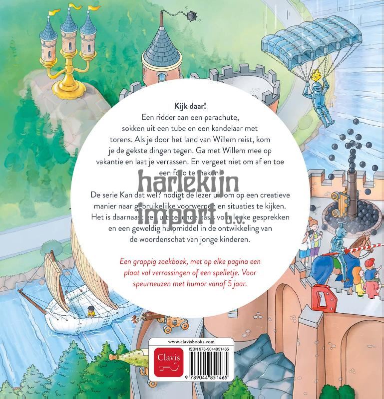 Kijk daar! Een ridder aan een parachute, sokken uit een tube en een kandelaar met torens. Als je door het land van Willem reist, kom je de gekste dingen tegen. Ga met Willem mee op vakantie en laat je verrassen. En vergeet niet om af en toe een foto te maken: anders geloven je vrienden nooit dat je dat allemaal écht hebt gezien! De serie Kan dat wel? nodigt de lezer uit om op een creatieve manier naar gebruikelijke voorwerpen en situaties te kijken. Het is daarnaast een uitstekende basis voor leuke gesprekken en een geweldig hulpmiddel in de ontwikkeling van de woordenschat van jonge kinderen. Een grappig zoekboek, met op elke pagina een plaat vol verrassingen of een spelletje. Voor speurneuzen met humor vanaf 5 jaar.