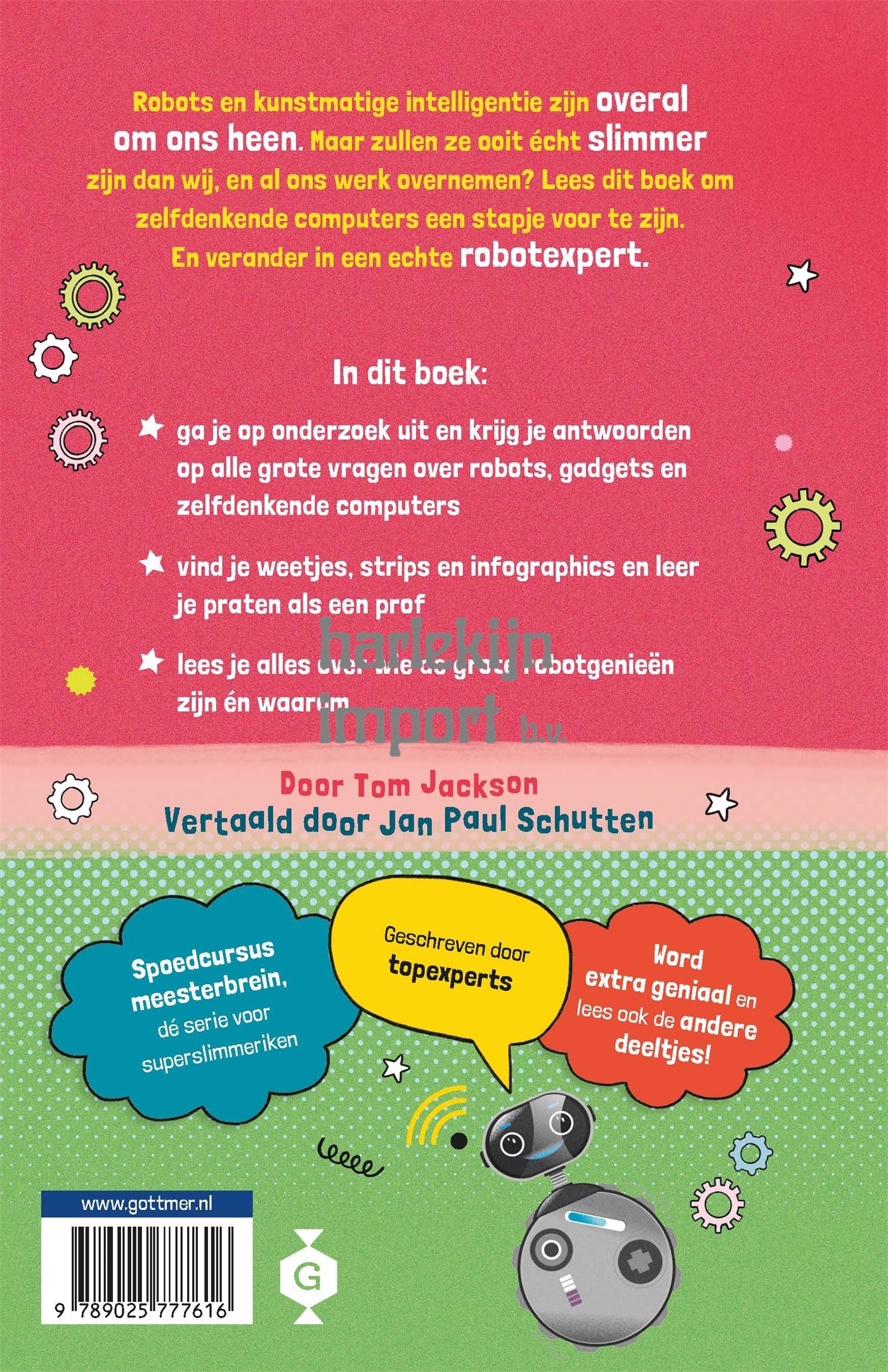 In dit deel van de superslimme serie 'Spoedcursus meesterbrein' leer je alles wat je wilt weten over kunstmatige intelligentie. De wereld is steeds meer digitaal verbonden en robots en kunstmatige intelligentie zijn overal om ons heen. Bijna iedereen ter wereld heeft een 'computer' op zak en misschien hebben we binnenkort ook allemaal wel een zelfdenkende robot. Maar willen we dat wel? Zullen robots ooit écht slimmer zijn dan wij, en al ons werk overnemen? En wat zijn de nieuwste ontdekkingen? Lees dit boek en ga op onderzoek uit. In de weetjes, strips en infographics vind je antwoorden op al je vragen over robots, gadgets en zelfdenkende computers. Je leest ook alles over wie de grote robotgenieën zijn én waarom. Duik in de 'Spoedcursus meesterbrein'-serie en word in no time een topexpert over van alles en nog wat. Deze superinformatieve en kleurrijk geïllustreerde serie is geschreven door gerenommeerde non-fictieauteurs, meegelezen door absolute helden in elk vakgebied en vertaald door een aantal van de beste non-fictieauteurs van Nederland. Vergroot je kennis, vocabulaire en begrip van onderwerpen als het klimaat, het universum, robots en artificiële intelligentie en oceanen.