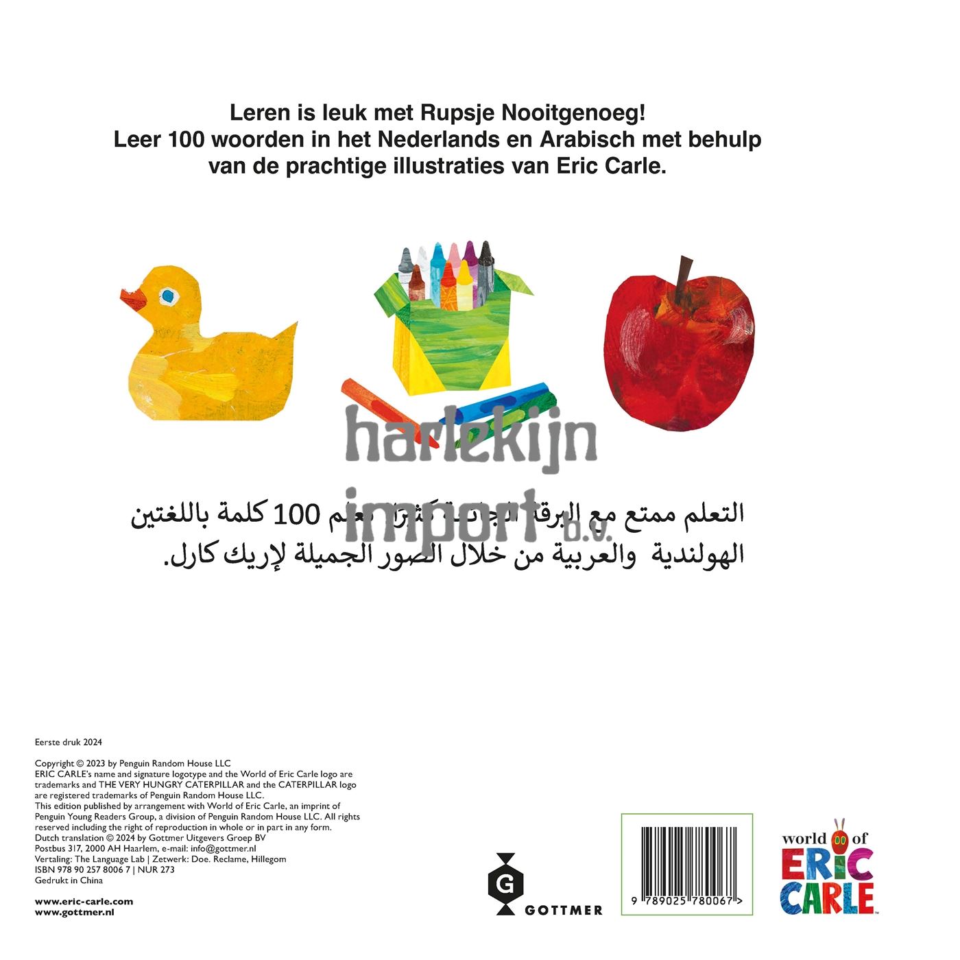 <p>Leer samen nieuwe woorden in het Arabisch of het Nederlands met het tweetalige boek 'Rupsje Nooitgenoeg - Rupsje Nooitgenoeg 100 eerste woordjes / Al-kalimât al-'ûlâ '. Deze bijzondere tweetalige kartonboekjes zijn ook verkrijgbaar in het Nederlands-Turks, Nederlands-Pools en Nederlands-Engels.<br><br>De taalvarianten zijn perfect voor nieuwsgierige peuters om zowel in hun moedertaal als in het Nederlands nieuwe woorden te leren. De herkenbare illustraties van Eric Carle brengen op een treffende manier de betekenis van elk woord tot leven. Het voorlezen in meerdere talen geeft ruimte aan en erkent de eigen taal, terwijl zowel voorlezer als kind tegelijkertijd het Nederlandse woord leren. Ontdek de magie van Rupsje Nooitgenoeg in verschillende talen en stimuleer de taalontwikkeling van jouw kleintje op een speelse manier!<br><br>Rupsje Nooitgenoeg, het meest iconische karakter van auteur en illustrator Eric Carle, heeft een speciaal plekje veroverd in de harten van jong en oud. Ondanks dat het gelijknamige prentenboek al meer dan 50 jaar geleden werd uitgebracht, blijft het een tijdloze favoriet. En dat is niet zonder reden: de heldere collage-illustraties en het vrolijke verhaal maken het nog steeds een waar genot om te lezen. Geschikt voor kinderen vanaf 2 jaar, is Rupsje Nooitgenoeg een onmisbaar onderdeel van elke boekenkast. Ontdek de magie van dit geliefde personage en beleef samen met je kleintje de wonderlijke avonturen van Rupsje Nooitgenoeg!</p>