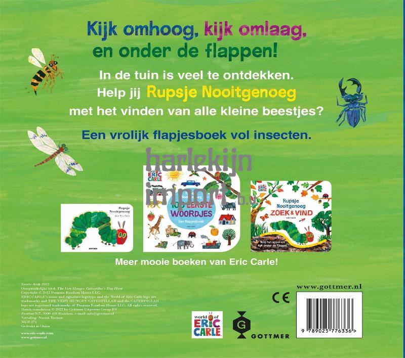 Ga met Rupsje Nooitgenoeg mee naar zijn domein om daar samen van alles - vaak heel gewoon en tóch heel bijzonder - te ontdekken. In dit flinke kartonboek vol grote flappen komt Rupsje Nooitgenoeg een heleboel oude bekenden uit de pen van Eric Carle tegen, zoals de spin, de krekel en de bij. Maar er komen ook nieuwe insecten voorbij om van alles over te leren. Ontdek welk beestje waar leeft, wanneer ze tevoorschijn komen en nog veel meer leuke feitjes.