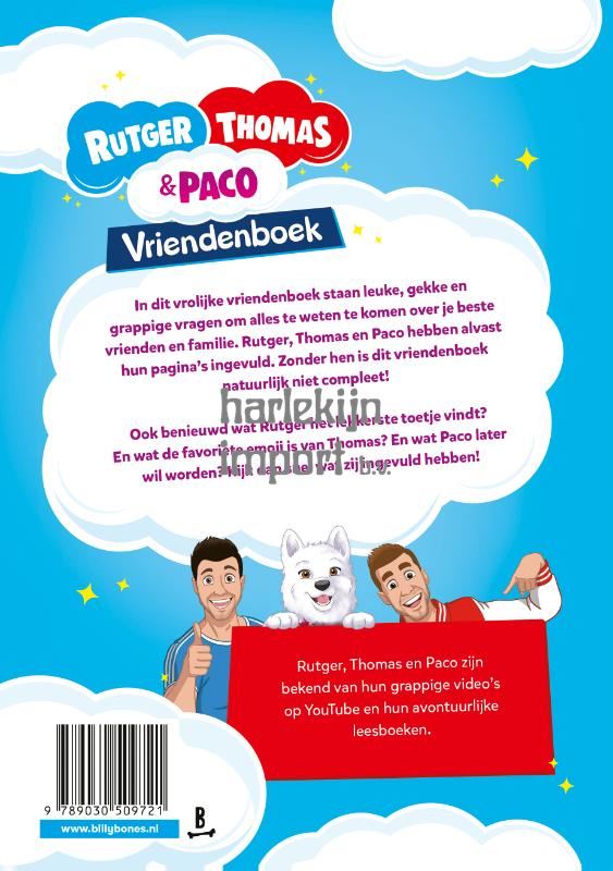 In dit vrolijke vriendenboek staan leuke, gekke en grappige vragen om alles te weten te komen over je beste vrienden en familie. Rutger, Thomas en Paco hebben alvast hun pagina's ingevuld. Zonder hen is dit vriendenboek natuurlijk niet compleet! Ook benieuwd wat Rutger het lekkerste toetje vindt? En wat de favoriete emoji is van Thomas? En wat Paco later wil worden? Kijk dan snel wat zij ingevuld hebben!