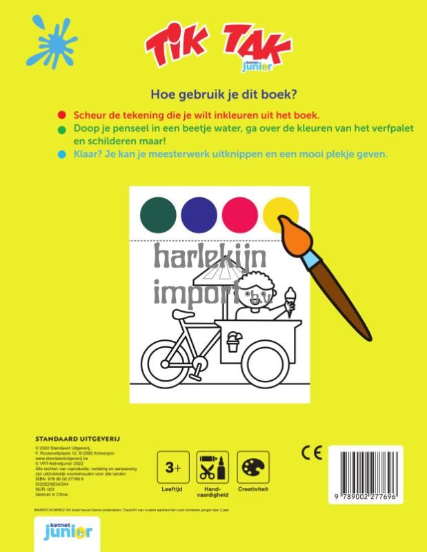 In dit kleurboek van Tik Tak vind je een gratis penseel en op elke pagina 4 kleuren waterverf. Doop het penseel in een beetje water, ga over de kleuren van het verfpalet en schilderen maar! De tekeningen zijn uitscheurbaar zodat je ze kan ophangen of cadeau geven.