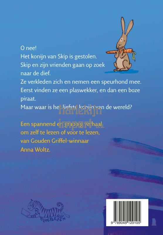 Skip heeft een stuiterhoofd. Hij denkt nooit aan één ding tegelijk. Behalve als zijn konijn Snuf op schoot zit. Maar op een middag na schooltijd is Snuf opeens verdwenen. Het hok is leeg en het deurtje staat wijd open. Is het konijn ontsnapt, of misschien gestolen? Skip en zijn vrienden Bennie en Olena weten het zeker: het was een dief. Als echte detectives gaan ze op onderzoek uit. Onderweg vinden ze een plaswekker en een piraat, maar geen konijn. Waar zou Snuf zijn? Een spannend en grappig detectiveverhaal van Gouden Griffel-winnaar Anna Woltz voor beginnende lezers, dat ook geschikt is om voor te lezen. Met wervelende illustraties van Lars Deltrap.