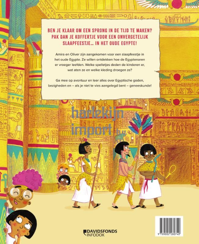 Ben je klaar om een sprong in de tijd te maken? Pak dan je koffertje voor een onvergetelijk slaapfeestje… in het oude Egypte! Amira en Oliver zijn aangekomen voor een slaapfeestje in het oude Egypte. Ze willen ontdekken hoe de Egyptenaren er vroeger leefden. Welke spelletjes deden de kinderen er, wat aten ze en welke kleding droegen ze? Ga mee op avontuur en leer alles over Egyptische goden, bezigheden en – als je niet te vies aangelegd bent – geneeskunde!