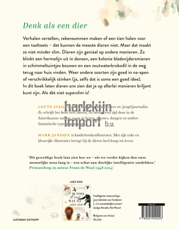 Lotte Stegeman en Mark Janssen (ill.), bekend van Ik voel ik voel wat jij niet ziet, duiken in Slimmer dan je denkt opnieuw in het hoofd van dieren. Dit keer gaat het niet over emoties bij dieren, maar over hoe slim ze zijn. Want dieren kunnen fantastische dingen. Mensen zijn slimme wezens. Als we willen, kunnen we samen zo’n beetje alles voor elkaar krijgen. We vinden iemand knap als die veel weet, negens haalt voor toetsen en tien stappen vooruit kan denken. Dat andere diersoorten die dingen allemaal niet kunnen, wil niet zeggen dat ze niet slim zijn. Want een bidsprinkhaan, platworm, koekoekshommel en octopus zijn geniaal op heel andere manieren. Een hermelijn kan maar beter uitblinken in dansen, een kolonie bladsnijdersmieren in schimmeltuintjes bouwen en vuurvliegjes in een lichtshow opvoeren. In prachtige, sprankelende en soms ongelooflijke verhalen komt een hele stoet aan dierlijke uitblinkers voorbij en laten ze zien dat je op verschillende manieren slim kunt zijn. ‘Je hangt aan Lotte Stegemans lippen als bij een perfect opgebouwde documentaire. En de illustraties van Mark Janssen – fenomenaal.’ Boekwijzer.com over Ik voel ik voel wat jij niet ziet