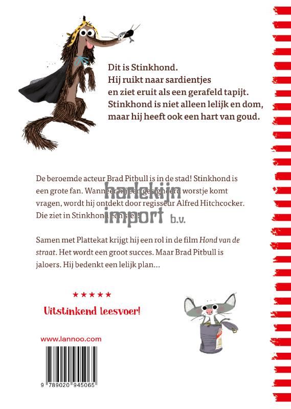 De beroemde acteur Brad Pittbull is in de stad! Stinkhond is een grote fan. Wanneer hij een gesigneerde worst komt vragen, wordt hij ontdekt door Alfred Hitchcocker, de regisseur. Die ziet in Stinkhond een ster! Samen met Plattekat krijgt hij een rol in de film Hond van de straat. Het wordt een groot succes. Maar Brad Pittbull is jaloers. Hij bedenkt een lelijk plan... 'Je wil 'm niet in je huis, maar als personage van een boekenreeks werkt Stinkhond als een tierelier.' - Het Nieuwsblad 'De avonturen zijn niet alleen ontzettend grappig en ondeugend, ze gaan ook over een onverwoestbare vriendschap.' - Boekwijzer.com v