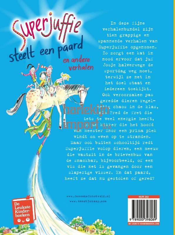 Spiksplinternieuwe verhalen over de leukste juf ter wereld: Superjuffie!In deze verhalenbundel zijn tien gloednieuwe spannende, ontroerende en grappige avonturen van Superjuffie opgenomen. Zo zorgt een kat in nood ervoor dat juf Josje halverwege de sportdag weg moet, terwijl ze net in het doel staat en iedereen toekijkt, en is er tijdens de verjaardag van meester Snor een deftig hondje dat niet meer naar huis durft. Maar ook op gewone dagen is er regelmatig wat aan de hand: want wat doet dat everzwijn langs de snelweg? En hoeveel stekels heeft een egel eigenlijk? Superjuffie steelt een paard en andere verhalen is een must-have voor de vele fans van de Superjuffie-serie, perfect om voor te lezen vanaf 6 jaar of zelf te lezen vanaf 7 jaar. Annet Schaap maakte de grappige illustraties.