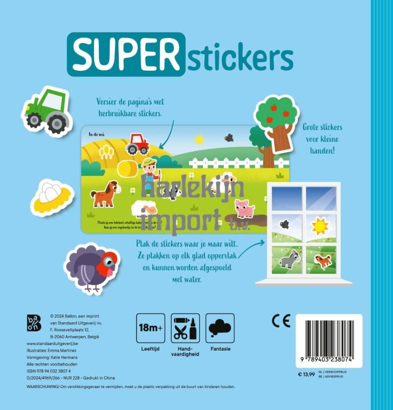 Deze superstickers zullen een favoriet van de kleintjes worden. Ze kunnen de paginagrote scènes in het boek opnieuw en opnieuw versieren. De stickers zijn makkelijk te hanteren en eindeloos herbruikbaar. Bovendien kun je ze op alle gladde oppervlakken plakken. Zo versier je het raam, de koelkast, je drinkfles… Klaar met spelen? De stickervellen kunnen bewaard worden in een gleuf binnenin het boek.