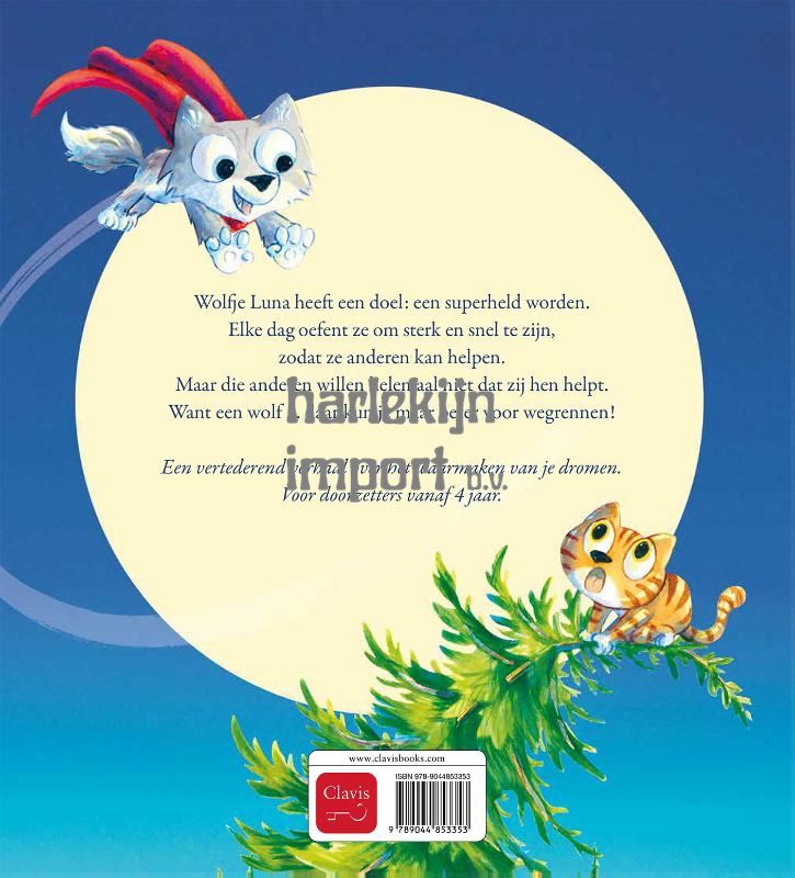 Wolfje Luna heeft een doel: een superheld worden. Elke dag oefent ze om sterk en snel te zijn, zodat ze anderen kan helpen. Maar die anderen willen helemaal niet dat zij hen helpt. Want een wolf … daar kun je maar beter voor wegrennen! Een vertederend verhaal over het waarmaken van je dromen. Voor doorzetters vanaf 4 jaar.