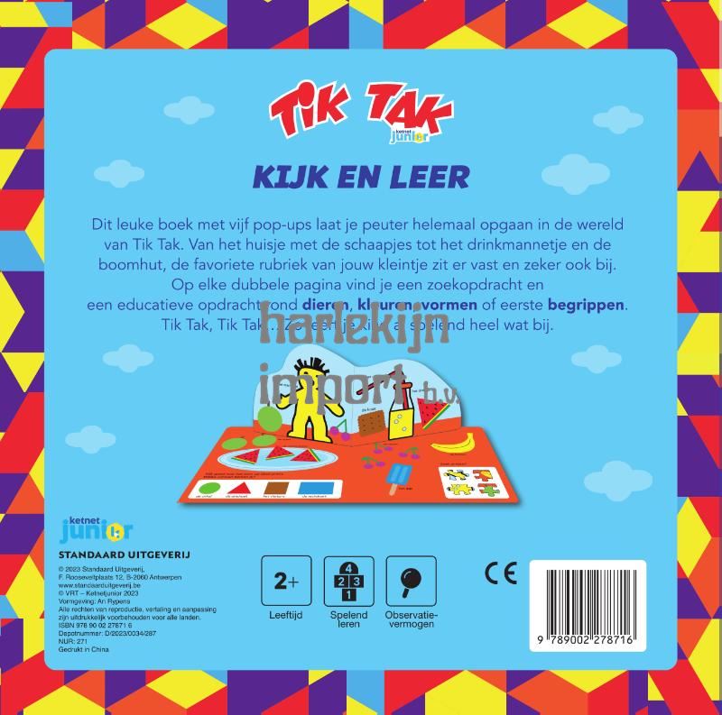 Dit leuke boek met vijf pop-ups laat je peuter helemaal opgaan in de wereld van Tik Tak. Van het huisje met de schaapjes tot het drinkmannetje en de boomhut, de favoriete rubriek van jouw kleintje zit er vast en zeker ook bij. Op elke dubbele pagina vind je een zoekopdracht en een educatieve opdracht rond dieren, kleuren, vormen of eerste begrippen. Tik Tak, Tik Tak⦠Zo leert je kind al spelend heel wat bij.