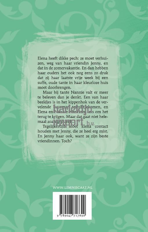 <p>Zul je altijd zien. Moet je verhuizen in de vakantie en dan hebben je ouders het zo druk dat jij de laatste vakantiedagen bij een suffe tante moet doorbrengen. Dat overkomt Elena. En dus zit ze daar, in het huis vol beeldjes van haar oude tante Nannie.<br />Maar Nannie is niet zo duf als ze eruitziet. Een kauw heeft een van haar beeldjes geroofd en dat is in het kippenhok van de buurman terechtgekomen. En Nannie heeft het niet zo op die buurman…<br />Elena en Nannie verzinnen iets om het beeldje terug te krijgen. Alleen gaat dat niet als gepland en Elena werkt zich steeds dieper in de nesten.</p><p>Janna de Lathouder is verteller en theatermaker, en dat merk je!<br />Naast de humoristische gebeurtenissen in de tuin en het huis (!) van de buurman, kom je als lezer meer te weten over de beste vriendin die Elena moest achterlaten. Was dat wel zo’n fijne vriendschap? Een boek om van te smullen!</p><p><br /></p>