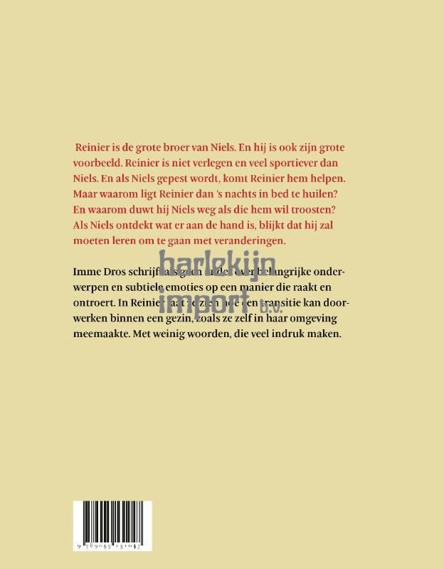 Niels wordt gepest door een jongen uit zijn klas, en dat maakt naar school gaan soms zwaar. Maar gelukkig kan hij altijd rekenen op de hulp van zijn broer Reinier. Niels bewondert hem en zou het liefst meer op hem willen lijken. Als Reinier steeds stiller en humeuriger wordt voelt Niels aan dat Reinier met een probleem worstelt. Hij probeert hem te helpen maar Reinier wil nergens over praten. Pas tijdens een vakantie komt het hoge woord eruit: hij is geen jongen, maar een meisje. De ouders reageren liefdevol en begrijpend, maar voor Niels lijkt het of zijn wereld instort. Moet hij nu zijn ideale broer missen? Een origineel en actueel verhaal van Imme Dros over het omgaan met een transitie binnen een gezin.