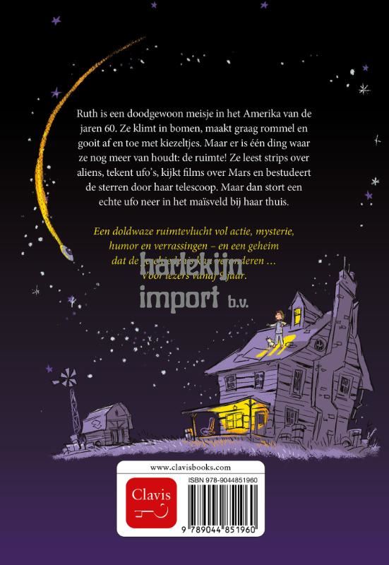 Ruth is een doodgewoon meisje in het Amerika van de jaren 60. Ze klimt in bomen, maakt graag rommel en gooit af en toe met kiezeltjes. Maar er is één ding waar ze nog meer van houdt: de ruimte! Ze leest strips over aliens, tekent ufo’s, kijkt films over Mars en bestudeert de sterren door haar telescoop. Maar dan stort een echte ufo neer in het maïsveld bij haar thuis. Een doldwaze ruimtevlucht vol actie, mysterie, humor en verrassingen – en een geheim dat de geschiedenis kan veranderen … Voor lezers vanaf 9 jaar.