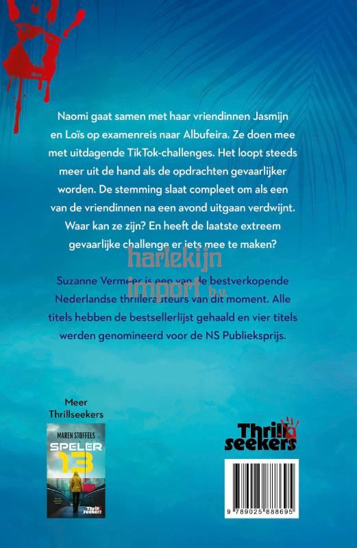 In Zonnesteek, de allereerste jeugdthriller van bestsellerauteur Suzanne Vermeer én onderdeel van de gloednieuwe serie Thrillseekers, draait tijdens een examenreis op Albufeira een TikTok-challenge uit op een nachtmerrie. Naomi gaat samen met haar vriendinnen Jasmijn en Loïs op examenreis naar Albufeira. Eenmaal aangekomen in de Portugese stad ontmoeten ze al snel een groep Nederlandse jongens. Een van de jongens vertelt dat er een spannende TikTok-challenge gaande is, en vraagt of de meiden zin hebben om mee te doen. Wat begint als een manier om lol te hebben, loopt steeds meer uit de hand als de opdrachten gevaarlijker worden. Terwijl de vakantie zo leuk begon, slaat de stemming compleet om als een van de vriendinnen na een avond uitgaan verdwenen is. Waar kan ze zijn? En heeft de laatste, extreem gevaarlijke challenge er iets mee te maken? Zonnesteek van Suzanne Vermeer is een van de eerste thrillers in de Thrillseekers-reeks: dé nieuwe serie voor jongeren die spanning en avontuur ademt. Deze pakkende thrillers weten zelfs de minst enthousiaste lezers te grijpen. Met dunne, toegankelijke boeken, geschreven door toonaangevende Nederlandse auteurs zoals Suzanne Vermeer en Maren Stoffels, belooft Thrillseekers een wervelende leeservaring: spannend, fris en eigentijds.