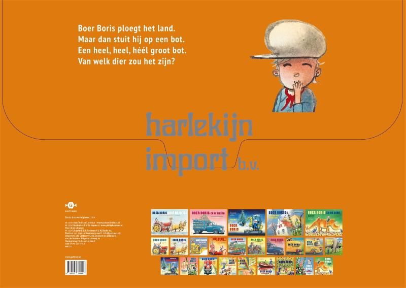 'Boer Boris en de dino', het negentiende deel in de razend populaire en bekroonde prentenboekenserie van Ted van Lieshout en Philip Hopman, in de vorm van grote vertelplaten. Perfect om voor te lezen op kinderdagverblijven, peuterspeelzalen en op basisscholen. In dit avontuur staat Boer Boris zijn land om te ploegen voor de suikerbieten. Maar dan, o nee, loopt de ploeg vast! Wat kan er aan de hand zijn? Jawel, er zit iets in de ploegenschaar! Een reusachtig bot! Maar van welk dier zou dat nou kunnen zijn? Een cavia? Een marmot? Boer Boris, Berend en Sam gaan op onderzoek uit en beginnen te graven. Ze ontdekken al snel honderd botten, compleet met een schedel. Deze stevige, losse A3-platen passen perfect in een standaard vertelkastje (niet meegeleverd), maar kunnen natuurlijk ook gewoon vastgehouden worden door de verteller tijdens het voorlezen. Al sinds 2012 werken Ted van Lieshout en Philip Hopman onvermoeibaar aan hun reeks boeken over Boer Boris, Sam, Berend en de boerderij. De twee vormen een waar topduo: Ted ontving in 2009 de Theo Thijssenprijs en in 2022 won Philip Hopman de Max Velthuijsprijs, elk voor hun ontzagwekkende oeuvre. Als een waar topduo hebben ze een heldere, vrolijke, maar vooral ook warme wereld rondom Boer Boris geschapen. Jonge kinderen zullen de tekeningen op de grote vertelplaten telkens weer willen bekijken - en hun ouders genieten mee.