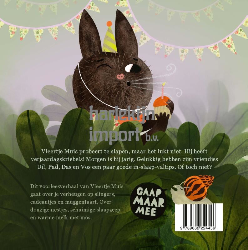Vleertje Muis probeert te slapen, maar het lukt niet. Hij heeft verjaardagskriebels! Morgen is hij jarig. Gelukkig hebben zijn vriendjes Uil, Pad, Das en Vos een paar goede in-slaap-val-tips. Of toch niet?Dit nieuwe voorleesverhaal van Vleertje Muis gaat over slaaprituelen, je verheugen op slingers, muggentaart en cadeautjes. Over donzige, zachte bedden, slaapzeep en warme melk met mos.Gaap lekker!