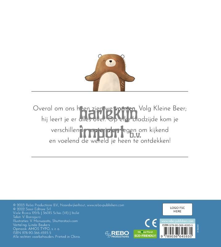 Overal om ons heen zien we vormen. Volg Kleine Beer; hij leert je er alles over. Op elke bladzijde kom je verschillende materialen tegen om kijkend en voelend de wereld om je heen te ontdekken!