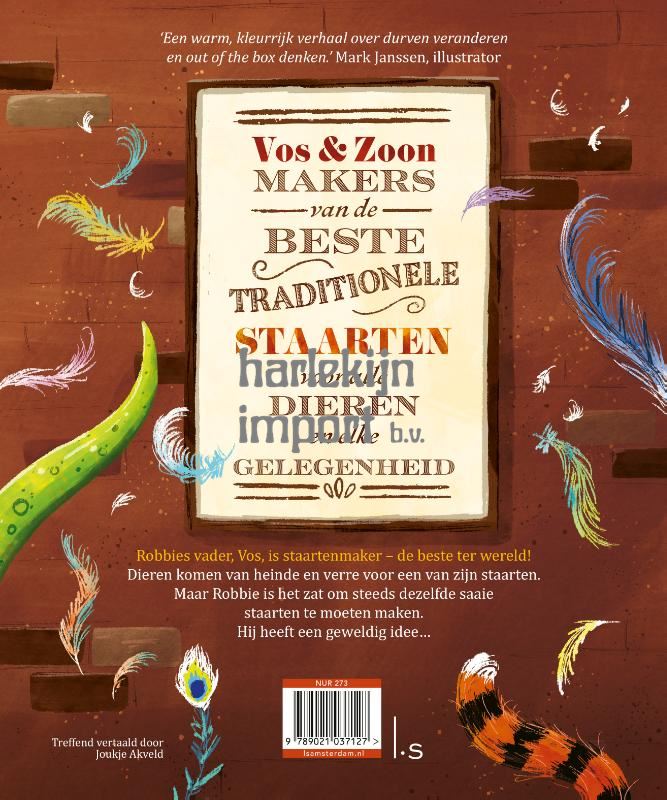 Met zijn prentenboek Vos & zoon trakteert Paddy Donnelly, bekend van Het meer dat verdwijnt, jonge kinderen op een kleurrijk en fantasievol spektakel. De sfeervolle illustraties van de Vlaams-Ierse schrijver-illustrator nodigen uit tot keer op keer bekijken. Robbie helpt zijn vader Vos in zijn winkel. Vos is de beste staartenmaker ter wereld. Allerlei dieren komen naar zijn winkel om de mooiste staarten te laten maken. Er zijn staarten voor bruiloften, voor verjaardagen en zelfs voor de eerste schooldag. Robbie meet de klanten op voor de perfecte staart. En dat is niet altijd makkelijk! Maar Robbie heeft er schoon genoeg van om dag in, dag uit dezelfde soort staarten te maken. Hij heeft een geweldig idee… ‘Wat een geweldig prentenboek van Paddy Donnelly! Het is een warm en kleurrijk verhaal over durven veranderen en out of the box denken.’ Mark Janssen, illustrator