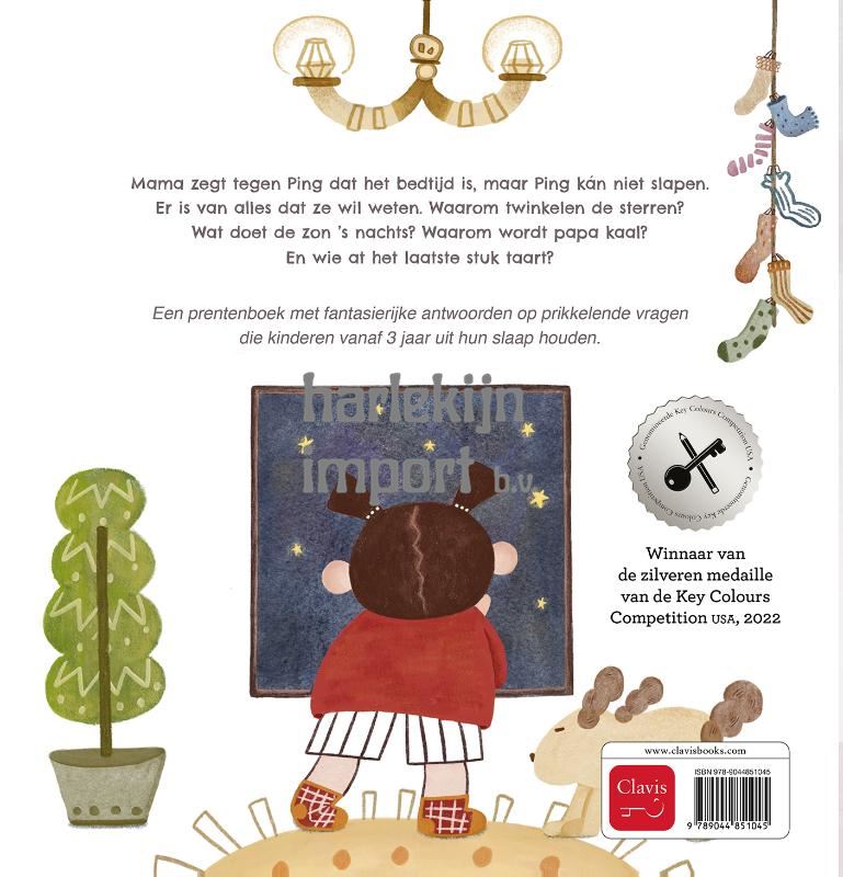 Mama zegt tegen Ping dat het bedtijd is, maar Ping kán niet slapen. Er is van alles dat ze wil weten. Waarom twinkelen de sterren? Wat doet de zon ’s nachts? Waarom wordt papa kaal? En wie at het laatste stuk taart? Een prentenboek met fantasierijke antwoorden op prikkelende vragen die kinderen vanaf 3 jaar uit hun slaap houden.
