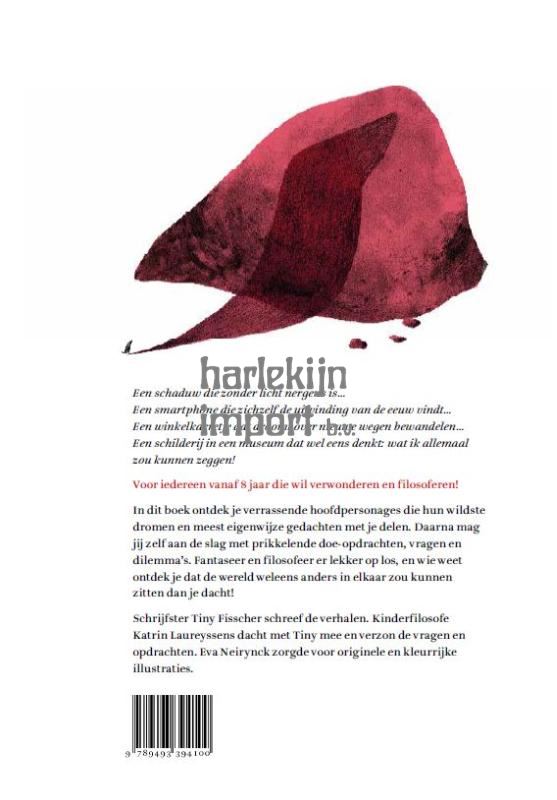 Verhalen om jezelf mee ondersteboven en achterstevoren te filosoferen Voor iedereen vanaf 8 jaar die wil verwonderen en filosoferen! In dit boek ontdek je verrassende hoofdpersonages die hun wildste dromen en meest eigenwijze gedachten met je delen. Daarna mag jij zelf aan de slag met prikkelende doe-opdrachten, vragen en dilemma’s. Fantaseer en filosofeer er lekker op los, en wie weet ontdek je dat de wereld weleens anders in elkaar zou kunnen zitten dan je dacht! Schrijfster Tiny Fisscher schreef de verhalen. Kinderfilosofe Katrin Laureyssens dacht met Tiny mee en verzon de vragen en opdrachten. Eva Neirynck zorgde voor originele en kleurrijke illustraties. Uit het boek: Een schaduw die zonder licht nergens is… Een smartphone die zichzelf de uitvinding van de eeuw vindt… Een winkelkarretje dat droomt over nieuwe wegen bewandelen… Een schilderij in een museum dat wel eens denkt: wat ik allemaal zou kunnen zeggen!
