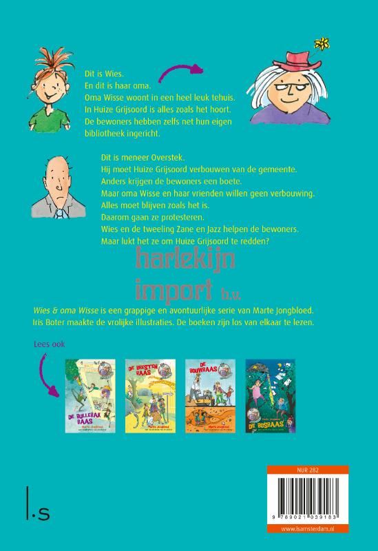 In De binnenbaas van Marte Jongbloed en Iris Boter (illustraties) beleven Wies en haar oma Wisse opnieuw grappige en spannende avonturen. In deze vrolijke leesserie voor kinderen die nog niet zoveel leeservaring hebben verschenen eerder De bullebakbaas, De beestenbaas, De bouwbaas en De bosbaas. Leesplezier is met deze serie wel heel makkelijk! Wies en de tweeling Zane en Jazz zijn graag in Huize Grijsoord, het gezellige tehuis van oma Wisse en haar vrienden. Op een dag komen er mannen met meetlinten langs. Ze zijn van Stichting Welzijn en Woonveiligheid. Hun baas zegt dat het tehuis moet worden verbouwd. De bewoners krijgen anders een torenhoge boete. Maar de verbouwing is een ramp. Het is ineens veel gevaarlijker om in Huize Grijsoord te wonen! Wies verzint samen met Zane en Jazz een actie om oma Wisse en haar vrienden te helpen. Wies & oma Wisse is inmiddels uitgegroeid tot een heerlijke serie voor jonge kinderen waarin leesplezier en leesmeters maken hand in hand gaan. Elke zin begint op een nieuwe regel en de boeken staan boordevol fullcolourillustraties. De delen zijn los van elkaar te lezen. ‘Deze serie mag niet ontbreken in een schoolbibliotheek!’ Rbbrleest op Hebban.nl