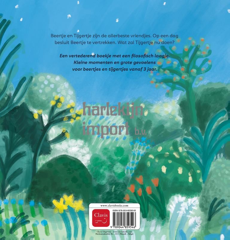 Beertje en Tijgertje zijn de allerbeste vriendjes. Op een dag besluit Beertje te vertrekken. Wat zal Tijgertje nu doen? Een vertederend boekje met een filosofisch laagje. Kleine momenten en grote gevoelens voor beertjes en tijgertjes vanaf 3 jaar.