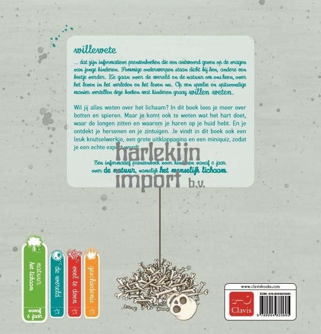 Willewete ... dat zijn informatieve prentenboeken die een antwoord geven op de vragen van jonge kinderen. Sommige onderwerpen staan dicht bij hen, andere een beetje verder. Ze gaan over de wereld en de natuur om ons heen, over het leven in het verleden en het leven nu. Op een speelse en spitsvondige manier vertellen deze boeken wat kinderen graag willen weten.Wil jij alles weten over het lichaam? In dit boek lees je meer over botten en spieren. Maar je komt ook te weten wat het hart doet, waar de longen zitten en waarom je haren op je huid hebt. En je ontdekt je hersenen en je zintuigen. Je vindt in dit boek ook een leuk knutselwerkje, een grote uitklappagina en een miniquiz, zodat je een echte expert wordt.Een informatief prentenboek voor kinderen vanaf 6 jaar over de natuur, namelijk het menselijk lichaam.