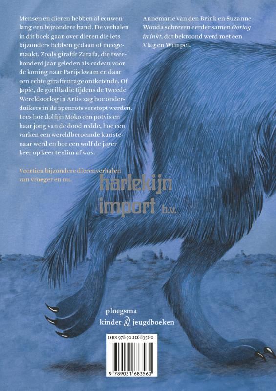 Mensen en dieren hebben al eeuwenlang een bijzondere band. De verhalen in dit boek gaan over dieren die iets bijzonders hebben gedaan of meegemaakt. Zoals giraffe Zarafa, die tweehonderd jaar geleden als cadeau voor de koning naar Parijs kwam en daar een echte giraffenrage ontketende. Of Japie, de gorilla die tijdens de Tweede Wereldoorlog in Artis zag hoe onderduikers in de apenrots verstopt werden. Lees hoe dolfijn Moko een potvis en haar jong van de dood redde, hoe een varken een wereldberoemde kunstenaar werd en hoe een wolf de jager keer op keer te slim af was.