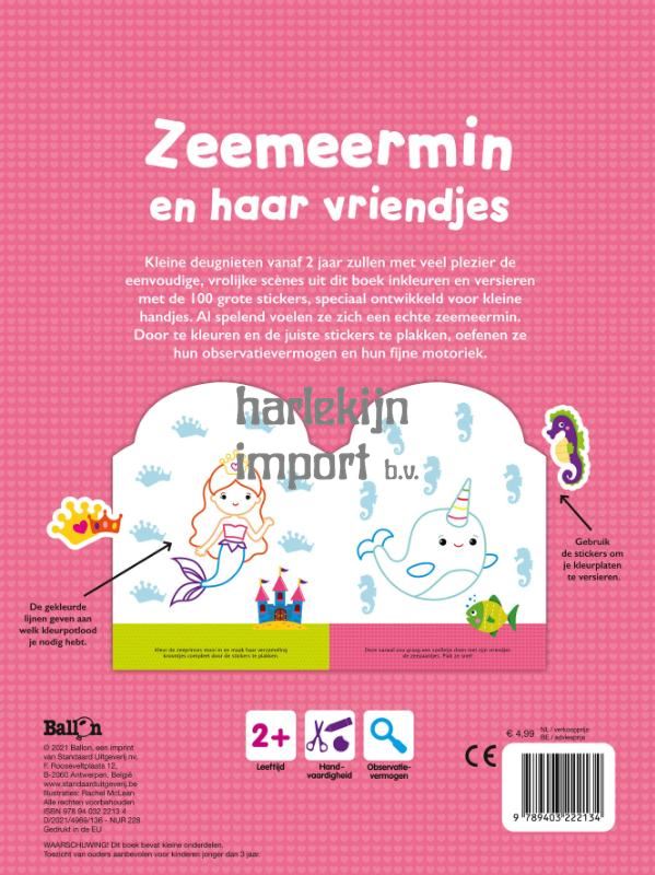 Vier leuke stickerboeken voor de allerkleinsten vanaf 2 jaar. De covers hebben een aantrekkelijke uitkap in de vorm van een fee, zeemeermin, ridder of brandweerman. Het binnenwerk bevat eenvoudige scènes die het kind kan versieren met grote stickers. Alle dieren en figuren kunnen ook ingekleurd worden. Er is duidelijk aangegeven waar de stickers moeten komen. Bovendien komt op elke bladzijde maar één soort sticker voor, wat het heel laagdrempelig maakt voor de kleinsten.