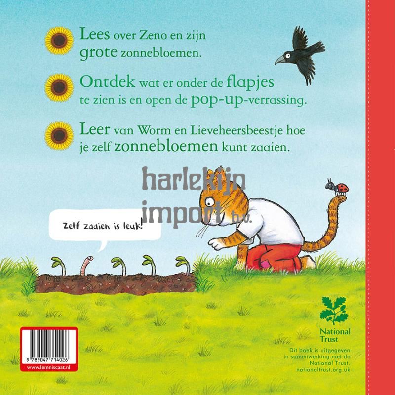 Zeno is gek op de zon. Hij vindt het zo jammer dat die niet elke dag zo mooi en geel aan de hemel staat! Zijn vrienden Worm en Lieveheersbeestje stellen hem voor om zelf zon te kweken: een grote gele zonnebloem. Zeno zaait dus snel wat zaadjes in zijn tuin. Samen met Zeno kun je ontdekken hoe zonnebloemen groeien. Til de flapjes op om te zien wat er onder de grond gebeurt... en geniet van een grote zonnebloem pop-up-verrassing. Een boek dat kinderen niet alleen een vrolijk geïllustreerd verhaal vertelt, maar ook leert hoe ze zelf een zonnebloem kunnen kweken.