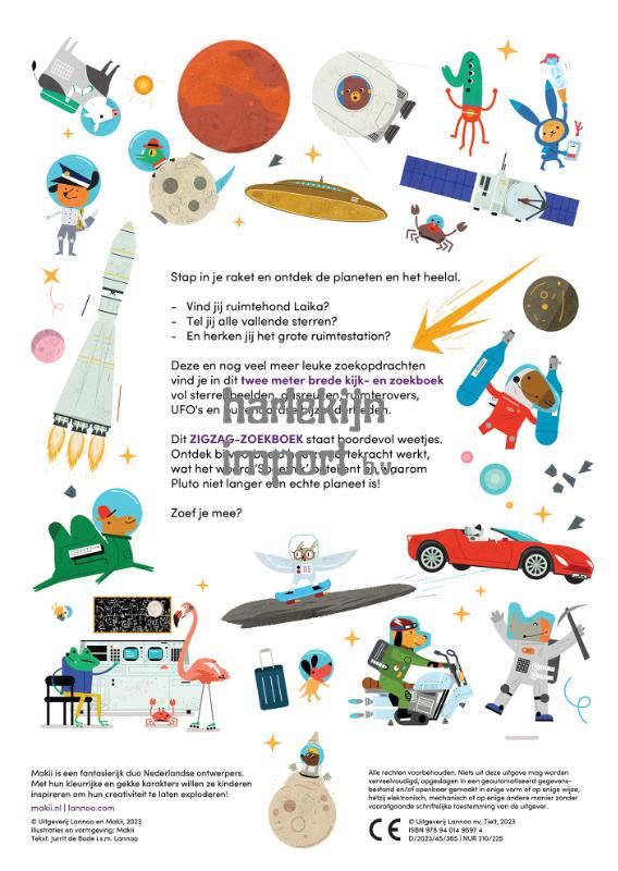 Stap in je raket en ontdek de planeten en het heelal. Vind jij ruimtehond Laika? Tel jij alle vallende sterren? En herken jij het grote ruimtestation? Deze en nog veel meer leuke zoekopdrachten vind je in dit twee meter brede kijk- en zoekboek vol sterrenbeelden, gasreuzen, ruimterovers, UFO's en buitenaardse bijzonderheden. Dit ZIGZAG-ZOEKBOEK staat boordevol weetjes. Ontdek bijvoorbeeld hoe zwaartekracht werkt, wat het woord 'Spoetnik' betekent en waarom Pluto niet langer een echte planeet is! Zoef je mee?