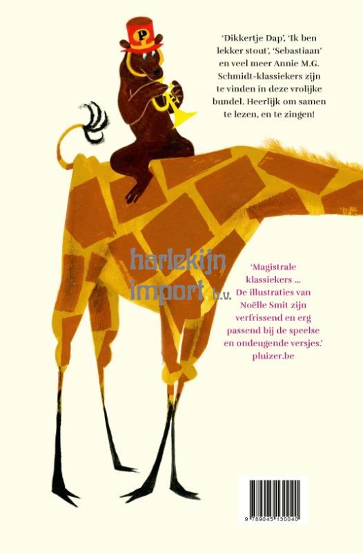 Niets is zo leuk als samen lezen en zingen. ‘Dikkertje Dap’ bijvoorbeeld, of ‘Het beertje Pippeloentje’, ‘Ik ben lekker stout’, ‘Sebastiaan’ en ‘De leeuw is los!’. Al die liedjes, en nog veel meer Annie M.G. Schmidt klassiekers, zijn te vinden in deze verrukkelijke bundel. Noëlle Smit maakte er illustraties bij en zette de vrolijke en altijd verrassende wereld van Annie M.G. Schmidt helemaal naar haar eigen hand. ‘Magistrale klassiekers … De illustraties van Noëlle Smit zijn verfrissend en erg passend bij de speelse en ondeugende versjes.’ Pluizer.be ‘Tijdloze versjes die weer nieuwe kinderharten zullen veroveren.’ Pluizuit.be