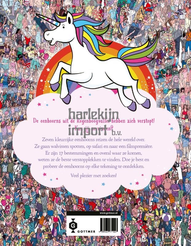 'Waar is de eenhoorn?' is een vrolijk en grappig zoekboek, geïllustreerd door Paul Moran, waarin je op zoek gaat naar alle zeven eenhoorns. De eenhoorns hebben hun favoriete verstopplekjes in de Regenboogvallei nu al zó vaak gebruikt dat ze op vakantie gaan. Ze komen op 17 bestemmingen en vinden de mooiste verstopplekken van de wereld; zo gaan ze walvisspotten, op safari en naar een filmpremière. De taak aan de echte speurneuzen om alle zeven eenhoorns (één in elke kleur van de regenboog) op elke tekening te vinden.