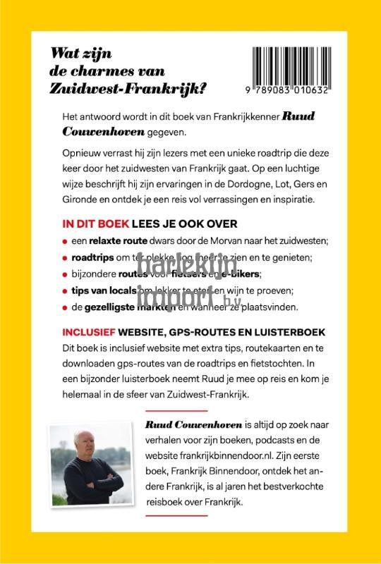 Wat zijn de charmes van Zuidwest-Frankrijk? Het antwoord wordt in dit boek van Frankrijkkenner Ruud Couwenhoven gegeven. Opnieuw verrast hij zijn lezers met een unieke roadtrip die deze keer door het zuidwesten van Frankrijk gaat. Op een luchtige wijze beschrijft hij zijn ervaringen in de Dordogne, Lot, Gers en Gironde en ontdek je een reis vol verrassingen en inspiratie IN DIT BOEK LEES JE OOK OVER - een relaxte route dwars door de Morvan naar het zuidwesten; - roadtrips om ter plekke nog meer te zien en te genieten; - bijzondere routes voor fietsers en e-bikers; - tips van locals om lekker te eten en wijn te proeven; - de gezelligste markten en wanneer ze plaatsvinden. INCLUSIEF WEBSITE, GPS-ROUTES EN LUISTERBOEK Dit boek is inclusief website met extra tips, routekaarten en te downloaden gps-routes van de roadtrips en fietstochten. In een bijzonder luisterboek neemt Ruud je mee op reis en kom je helemaal in de sfeer van Zuidwest-Frankrijk. Ruud Couwenhoven is altijd op zoek naar verhalen voor zijn boeken, podcasts en de website frankrijkbinnendoor.nl. Zijn eerste boek, Frankrijk Binnendoor, ontdek het an- dere Frankrijk, is al jaren het bestverkochte reisboek over Frankrijk.