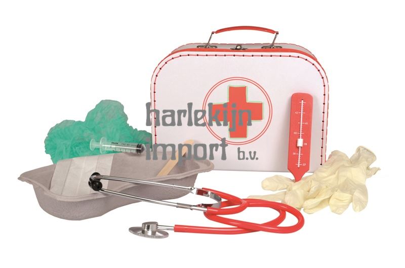 In het dokterskoffertje zit alles wat dokters of verpleeegsters (verplegers) nodig kunnen hebben: een echte stethoscoop, thermometer, spuit, rubber handschoenen, mondmasker, haarnetje en tongstokje. Vanaf 3 jaar.