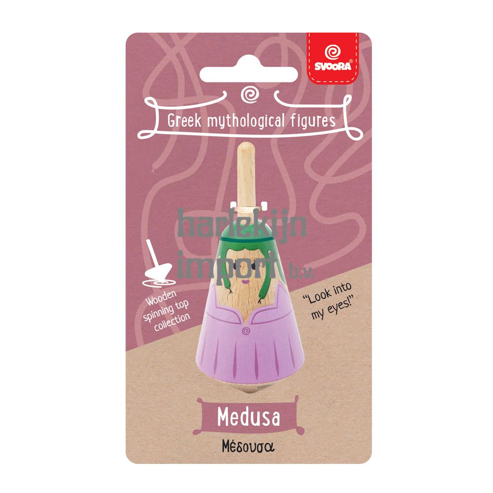 Griekse houten tol: Medusa. 3,5x3,5x8 cm. 5+ |