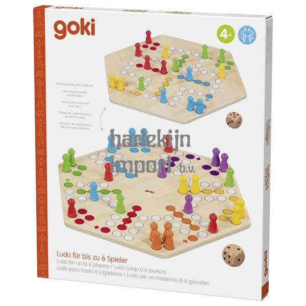 Ludo voor maximaal 6 spelers, dubbelzijdig bedrukt. 26 delig. 34 cm. 4+ |
