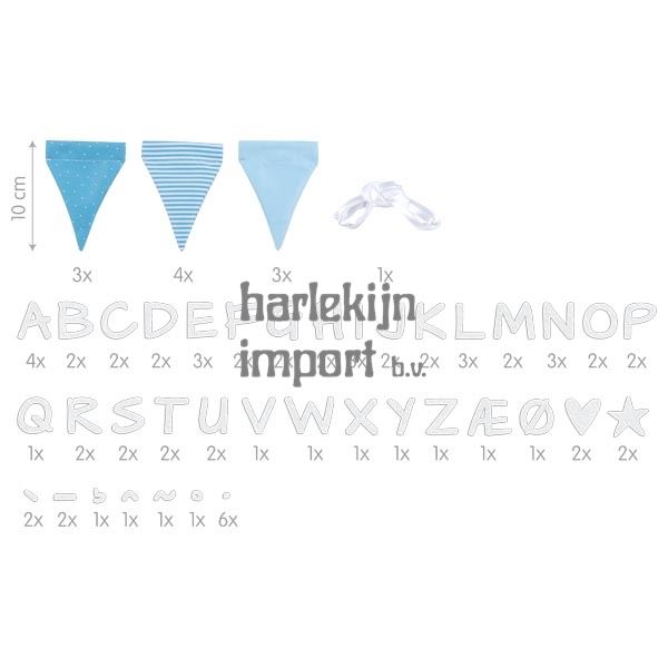 Naamslinger, blauw, met 10 wimpels. 150 cm. wimpel: 7,5x10 cm.
