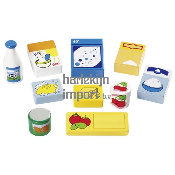 Speelgoedwinkelminiaturen in een mand, voedsel en huishoudelijke artikelen. 10 delig. 21 cm. 3+