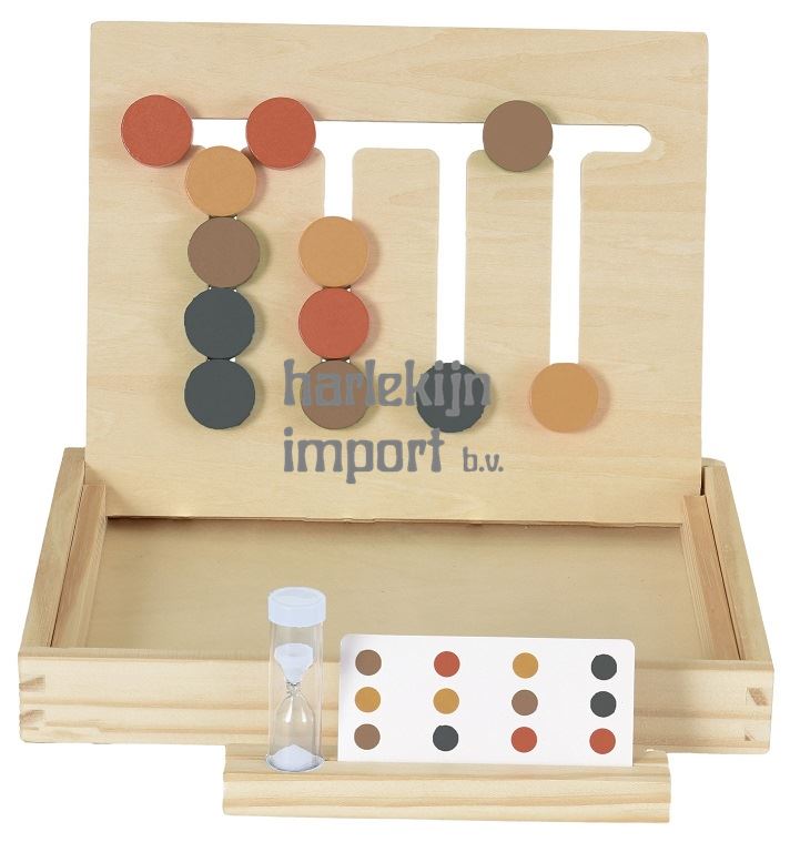 Kies willekeurig een kaart en probeer de tekening na te maken op het bord, voor de zandloper leeg is, door met de schijfjes te schuiven.