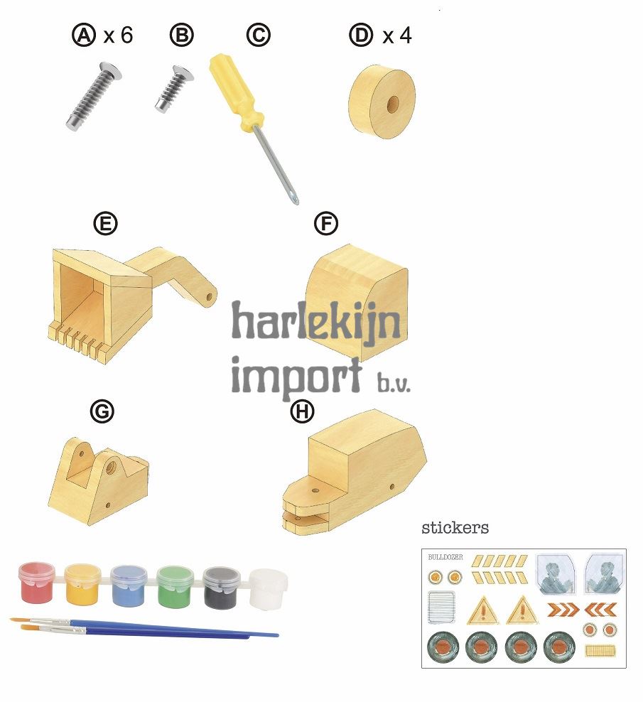 Assembleren, verven en decoreren…Volg de instructies en bouw een houten bulldozer.