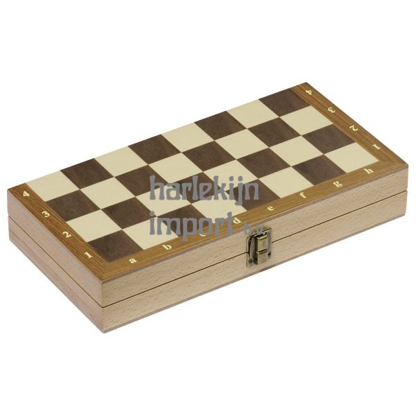 Schaakspel in een houten scharnierende kist. 29,9x29,9x4,8 cm. 7+